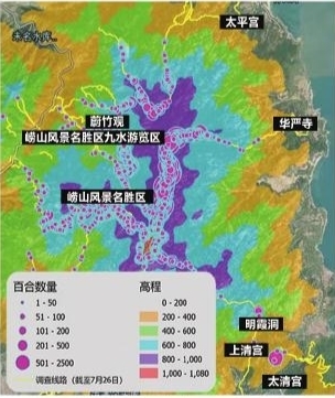 根据全省生物多样性保护工作的部署,青岛市生态环境局委托青岛农业大学建设了青岛百合养护观测站。该养护观测站的建设是长期定位观测青岛百合生态环境与生长状态的有效手段,能够第一时间获得青岛百合生态环境的光照、水文、风力、土壤等方面的数据信息。研究人员通过组织收集与青岛百合相关的植物志、科考报告、新闻报道、高清遥感图像、地形图等资料,了解青岛百合可能分布的区域,以及区域内相关调查工作的开展情况,整理调查区域内河流、土壤、植被、气候、地形地貌、道路等数据资料,确定了以崂山为重点区域的全域调查计划。