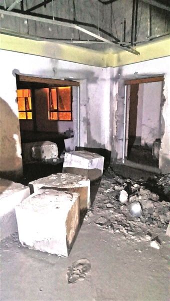 尹先生表示,他家住在标山路77号十五大街A1区,8月17日晚上10点多,他听到楼下有叉车、货车的声音,还有不少居民在楼下呼喊,他跑下楼查看,发现自家单元楼下的网点房正在施工。“当时我一下楼,就听到有邻居说施工人员把网点房的承重墙拆了,大家都在现场制止施工。”尹先生说道,当时工人正在将拆除的墙面水泥块从网点房内往外搬,他立即跑到网点房内查看,发现屋内确实有墙面被砸拆了。