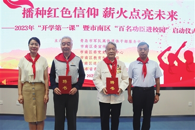 8月28日,青岛市军休服务中心联合市南区教育和体育局、市南区委宣传部、市南区委党史研究中心、市南区退役军人事务局,共同启动“播种红色信仰薪火点亮未来”2023年“开学第一课”暨市南区“百名功臣进校园”活动,军休干部郑成琛、高华成走进青岛一中市南分校,通过分享自身军旅故事,让“开学季”注满红色基因,让“第一课”汇聚精神力量。
