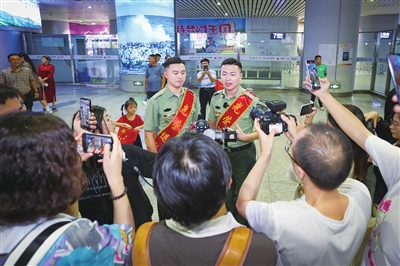 “原中国人民解放军陆军中士陈裴宇、陈泉洲已圆满完成服役任务。长子陈裴宇、次子陈泉洲返乡报到,请指示!”“欢迎回家!”去年10月28日,早报独家报道了青岛一对双胞胎兵哥哥同日参军、同日结婚的消息后,今年9月4日,兄弟两人一同退役回家。双胞胎兵哥哥的亲友团、粉丝团60多人拉着横幅、挥舞着国旗,像迎接明星一样在铁路青岛北站欢迎他们,其他旅客看到这个场景后,也纷纷加入欢迎团队中。“他们就是我们心中的明星!”专门从城阳赶来迎接双胞胎兵哥哥的粉丝王超说。