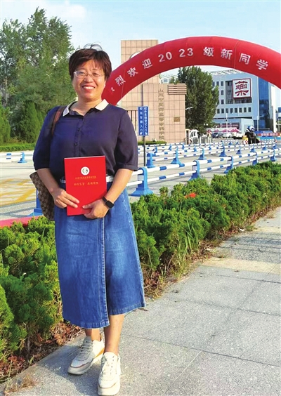 9月7日,在位于烟台市的山东中医药高等专科学校门口,48岁的青岛居民王美霞拿着手机激动地拍着照片。与校门口其他同龄人不同的是,她并不是来送孩子上大学的,而是来学校报到的。