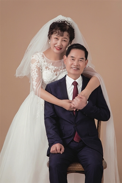 活动中,张金盛、郭相珠夫妇正值金婚,这对夫妻亲身向我们演绎了现实版的“父母爱情”。来到拍摄基地,张金盛夫妇牵着手坐在沙发上向我们讲述他们的爱情故事,两人相视含笑的模样沉淀了岁月的味道。“我们那时候可没有婚纱照,但也热热闹闹地办了仪式,在婆婆家里摆了好几桌,也邀请了好多朋友。”郭相珠回忆起两人的婚礼,“我们后来还补拍了婚纱照,一晃都好多年啦,今天能再来拍一次,真的很开心很激动。”张金盛年过古稀,但戎装在身仍英姿飒爽。一袭洁白婚纱,73岁的爱妻郭相珠依然是他眼中的最美新娘。这对携手50载的夫妻,面对镜头,再许白头偕老的庄严约定。