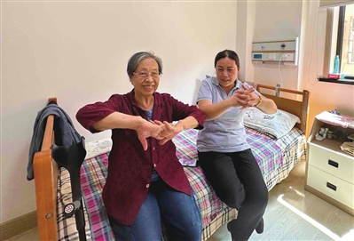 记者看到,每间房间里都有独立卫生间供老人洗漱,房间里安装有中央空调,床头配有按铃、呼叫器、床铺调节器及吸氧接口,以备不时之需。护理员将李秀珍老人的房间收拾得干干净净,井井有条。散步结束后,老人回到房间,在护理员的带领下开始做手指操。
