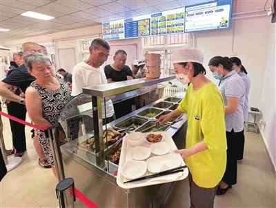 干炸刀鱼、酱爆鸡丁、红烧冬瓜、茭瓜木耳炒蛋……午餐时间,海伦路街道综合养老服务中心的餐厅里陆续摆放上十道荤素搭配、色香味俱全的佳肴。不到十一点半,老人们就已按照手中的用餐号排起了长队。“在家里做不了这么多花样,吃过几次味道真不错。”前来排队就餐的老年人对热气腾腾的菜品赞不绝口。开餐后,工作人员根据老人的选择,帮老人细心地盛好饭菜。