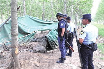 接到求助后,中队长周洪杰立即带领队员赶往现场。在猪主人的指引下,民警找到了种猪藏匿的位置,只见这头受惊种猪眼睛发亮,时刻保持警惕状态,随时可能冲撞前来控制它的人,人们根本无法靠近。经过对周边环境进行细致勘察后,周洪杰在适当时机果断开枪将猪击毙。