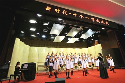 右图:青岛新世纪学校六年级1班的同学们在舞台上演唱合唱曲目。