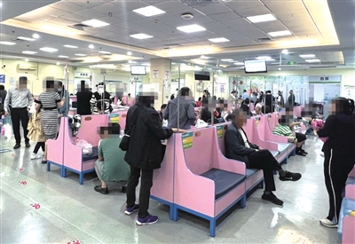 不仅正在输液的患儿多,还有很多家长陪着孩子正在排队就诊或等待输液。“孩子最开始在学校吐了,老师发现是发烧了,我们在家吃了两天药还是烧,最高时烧到40℃,这两天慢慢降下来了,但还是超过37℃。”正在排队就诊的李女士告诉记者,最近孩子班里有两三个同学请假了,她也决定让孩子彻底康复后休息几天,然后再去学校。