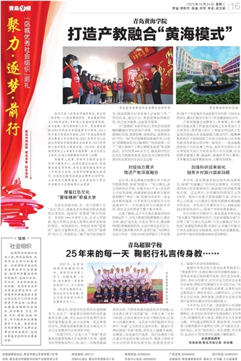 多年来,青岛黄海学院加强科研成果转化,探索“校城融合”的科研发展模式,有效促进科技与经济紧密结合,推进地方经济提质增效升级。过去两年,学校横向科研项目立项176项。服务乡村振兴国家战略方面,学校与灵山卫街道、六汪镇签订党组织联建共建战略合作协议。学校成立非遗研究中心、ESB创新创业师资培训中心,探索产学研发展新路径。