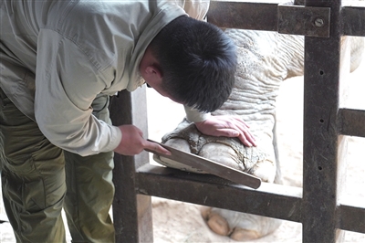 图3:保育员为大象修剪指甲。