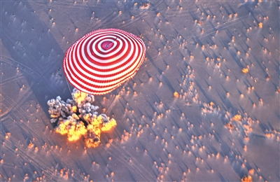 “博士乘组”凯旋归家,离不开航天科技为神舟十六号的回家之路保驾护航。“神舟大伞”绽放天地之间,红白伞花绚丽无比。