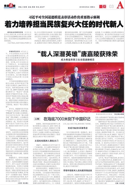 “2019年我有幸荣获了第七届全国道德模范,这份荣誉是对我及‘蛟龙’号技术保障团队工作的肯定、激励。”据唐嘉陵介绍,2020年以来,团队先后承担了中国大洋航次十余段深海装备应用保障任务,航程十几万海里,累计海上作业天数500多天,获取了大量珍贵的地质样品、生物样品和海底视频、环境数据资料。