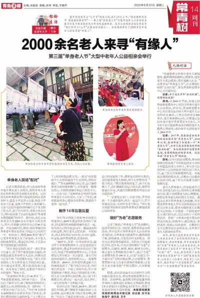 “2007年,我们喜康助老服务中心承办了青岛市中老年人公益相亲会,成为报名点之一,结果被前来报名的单身中老年朋友挤得满满当当,第一次就有3000多人。了解到单身中老年人的痛苦和烦恼,激发了我想要帮助他们的爱心,正是这种心情驱使着我一直走到现在。”