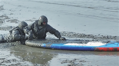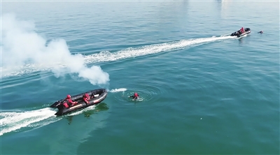 在另外一个演练现场,胶州湾大桥坠海车辆上的乘客逃生时,不慎陷入潮间带淤泥中。救援人员携带桨板,利用搭建人梯的方式,营救被困人员。与此同时,坠海车辆沉至海底,救援人员立即通过水下机器人对事发区域开展水下侦察。潜水分队抵达车辆落水位置附近后,救援人员于船舷的左右两侧分别采用背滚式入水的方式,潜入水底开展环形搜救。在成功锁定坠海车辆的位置后,释放漂浮定位信标,告知辅助救援艇打捞位置,成功将遇险人员和车辆打捞上岸。