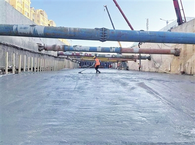 在北半幅地道段施工现场,施工人员正用数米长的振捣棒帮助水泥均匀分布,提高凝固质量,让地道墙壁看起来更美观。浇筑、振捣、养护……辽阳路地道施工采用了青岛地铁的绿色低碳高品质混凝土技术,全面提升混凝土质量,用手触摸光滑细腻,真正实现了混凝土的内实外美。同时地道墙壁将作为隧道内永久景观对外展示,打造出清水混凝土风格的低碳建筑。