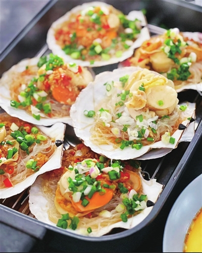 “这道菜属于粤式海鲜蒸菜,是粤菜中的经典菜。”韩师傅用的主料是扇贝、粉丝、蒜蓉、香葱,调味料为生抽、耗油等。“这菜讲究的是鲜嫰,做法并不复杂,最关键的就是蒸制的时间和蒜蓉的炒制,做好了就有餐厅的味道!” 蒜蓉是需要加工的,先将蒜头拍扁剁细,再加点盐捣烂,放葱花、胡椒粉、味精,食用油加热浇在上面,最后在上面浇上一层香油。将做好的蒜蓉分成两份,一份蒜蓉先放在热油中炒香,关火后下入另外一份快速翻炒均匀,这样炒制出来的蒜蓉在扇贝蒸制的时候会更突出蒜香的味道。