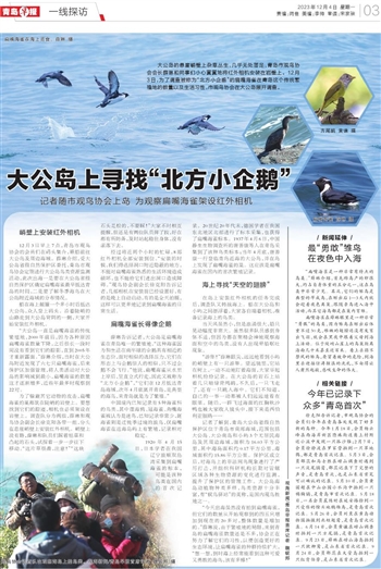 薛琳告诉记者,大公岛是扁嘴海雀在青岛唯一的繁殖地,“这种海雀因为和生活在南半球的企鹅具有相近的生态位,面对相似的选择压力,它们在形态上与企鹅惊人的相似,只不过企鹅不会飞行。”他说,扁嘴海雀从水里上岸后,呈直立式行走,因此又被称为“北方小企鹅”,“它们在12月抵达青岛海域,次年4月底离开青岛,是典型的海鸟,来青岛就是为了繁殖。”