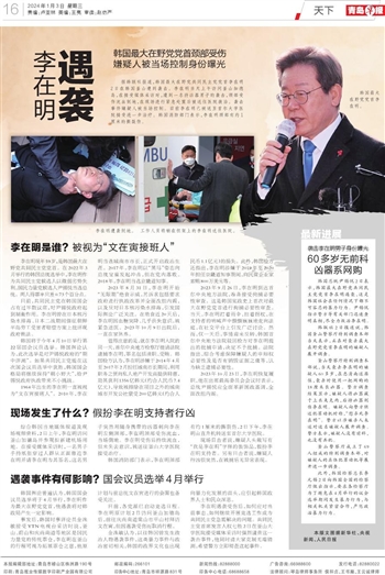 韩国舆论普遍认为,韩国国会议员选举将于4月举行,李在明作为最大在野党党首,他遇袭将对韩政局产生一定影响。