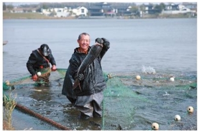 11月 在胶州市里岔镇,村民展示刚刚捕捞上岸的大鱼。