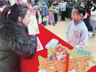 为了让孩子们拥有趣味盎然的测评体验,一年级的老师和家长们提前营造了喜气洋洋的过年情境,红红火火的年货街市中有“双龙戏珠”“卧虎藏龙”“神龙摆尾”等将语文知识与传统文化融合的拼字诵读游戏,还有“年货购买”“年货分类”“年货整理”“年货市集”等将数学知识与劳动融合的实践游戏……