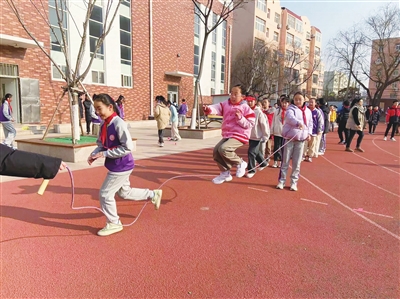 “学生们对于多出5分钟的课间时间都非常喜欢,老师也增加了与学生共处的时间。”虎山路小学六年级三班班主任牟帅每逢课间都会跟学生一起跳大绳,“我们还会一起踢毽子、踢足球、打乒乓球,这些活动以前课间都来不及玩,现在时间充足了,学生们可以选择更多自己喜欢的运动。”