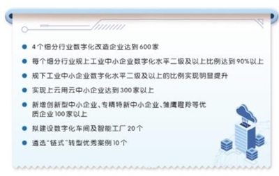 青岛市中小企业数字化转型城市试点建设目标主要有:4个细分行业数字化改造企业达到600家,每个细分行业规上工业中小企业数字化水平二级及以上比例达到90%以上,规下工业中小企业数字化水平二级及以上的比例实现明显提升。实现上云用云中小企业达到300家以上,新增创新型中小企业、专精特新中小企业、雏鹰瞪羚等优质企业100家以上,拟建设数字化车间及智能工厂20个,遴选“链式”转型优秀案例10个,总结一批“链式”转型模式,上线一批细分行业特定领域工业互联网平台。