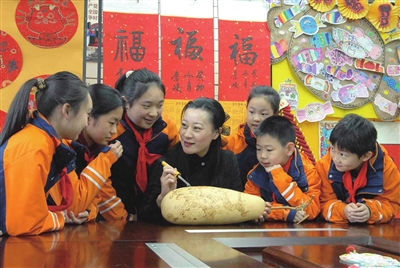 早报1月16日讯 “起稿最关键,脑中要先有轮廓,然后用铅笔在葫芦上画出来,最后再用电烙铁画。”1月16日,在山东省青岛市即墨区创智实验学校,葫芦烙画非遗传承人黄旭指导学生进行葫芦烙画练习。学生们在葫芦上运用烙画传统技艺烙出龙年生肖的吉祥图案,迎接龙年新春。