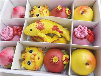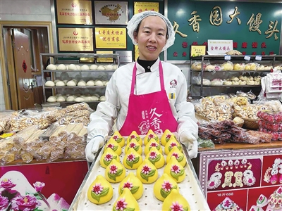 鼎盛香大馒头则特别制作了卡通龙馒头,浅黄色的小龙憨态可掬,红色福印更添喜气。“我们想着正好要到龙年了,大家肯定对龙元素的馒头很感兴趣,请人设计了五款龙模具,挨个尝试挑选出效果最好、脱模速度最快的一款。除此之外,我们今年的礼盒上也都印了龙的图案。”鼎盛香甜食品有限公司总经理崔雪娇展示了几款龙年礼盒中的馒头:苹果馒头栩栩如生透着红润,寓意平平安安;金元宝馒头拿在手中沉甸甸,寓意招财进宝;精致可爱的红色福袋用“花绳”抓紧,顶部还点缀了一个迷你版金色福袋,寓意福气满满……礼盒价格在58元到188元之间,顾客们可以根据自己的喜好挑选馒头样式组合。