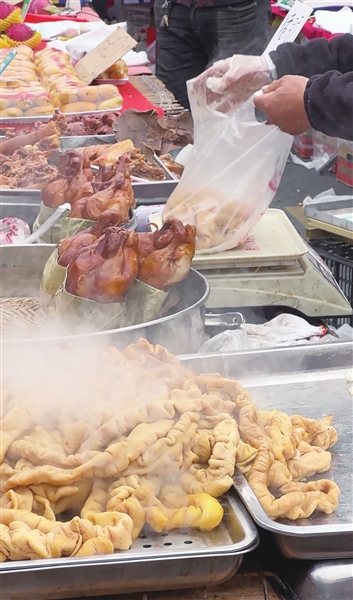 提到“流亭”,很多人都能想到“流亭猪蹄”,记者观察到,流亭大集上并没有真正意义的“流亭猪蹄”售卖,倒是有不少熟食摊位的酱货、卤货很受欢迎。大集上还有很多小孩子喜欢吃的花生糖、江米条、糖葫芦等等,“我们都是现做现卖,很快就能卖完,这锅糖我们刚熬好,很多人喜欢刚出锅的糖葫芦,一咬嘎嘣脆。”一名售卖糖葫芦的摊主说。