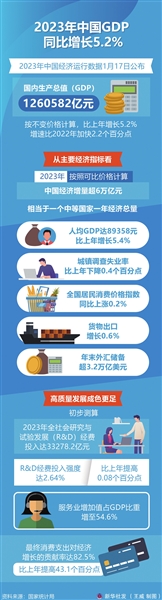2023年中国经济运行数据17日公布:国内生产总值(GDP)1260582亿元,按不变价格计算,比上年增长5.2%,增速比2022年加快2.2个百分点。国家统计局局长康义当日在国新办发布会上表示,2023年,我国顶住外部压力、克服内部困难,国民经济回升向好,高质量发展扎实推进,主要预期目标圆满实现。