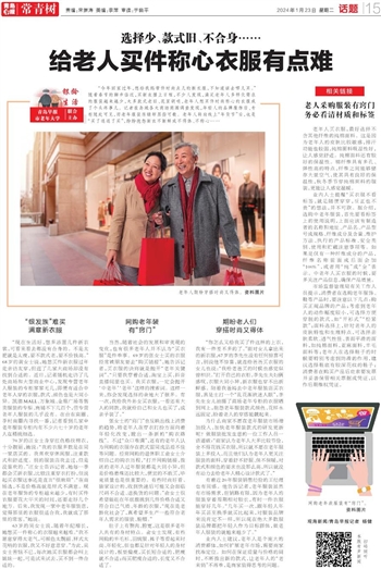 “今年回家过年,想给我妈带件时尚点儿的新衣服,不知道该去哪儿买。”随着春节的脚步临近,买新衣摆上日程,不少人发现,满足老年人多样化需求的服装越来越少,大多款式老旧、花里胡哨,老年人想买件时尚称心的衣服成了个头疼事儿。记者在岛城各大商场商圈调查发现,年轻人的品牌服饰店、专柜随处可见,而老年服装店铺却屈指可数。老年人转向线上“年货节”后,也是“买了退退了买”,纷纷抱怨新衣不新鲜或不得体、不称心……