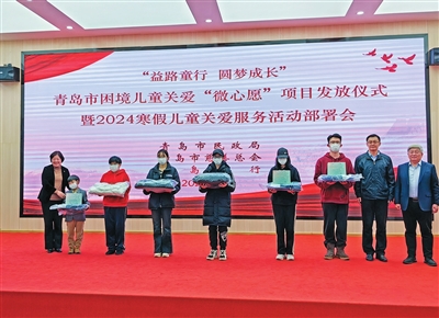 日前,青岛市民政局联合青岛市慈善总会、青岛银行举办了“益路童行 圆梦成长”青岛市困境儿童关爱“微心愿”项目发放仪式暨2024寒假儿童关爱服务活动部署会,让孩子们现场圆梦。近期,全市2000多名儿童督导员、儿童主任将开展“上门圆梦”行动,真诚送温暖,真心护成长。“益路童行 圆梦成长”青岛市困境儿童关爱“微心愿”项目由青岛银行发起并捐资100万元,旨在为全市孤儿、事实无人抚养儿童、重点困境儿童、低保边缘家庭儿童和农村留守儿童实现“微心愿”,提升困境儿童的获得感、幸福感。项目自启动以来,收到了孩子们关于服装、课外书籍、学习桌椅等心愿,本次将为1800余名孩子圆梦。