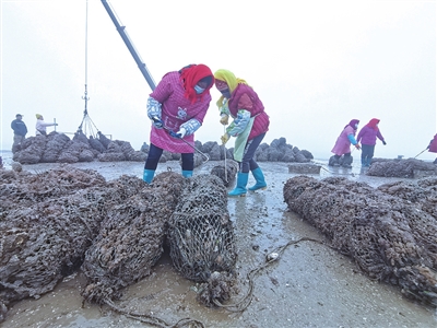 “海上的气温比陆地上低了不少,加上雾气比较浓,给捕捞作业带来了很大影响。不过幸好是近海捕捞,都是有着几十年经验的老渔民。”58岁的养殖户老张介绍,因为春节期间市场需求量很大,所以从大年初三开始,每天都要出海捕捞海蛎子,最多一天上岸10万多斤。为了保证海蛎子的鲜度,老张从当地找来20多名渔家大嫂在码头上帮工,每天捕捞船一靠岸,大家就开始忙着腾笼、分拣,当天就能运往各大市场。