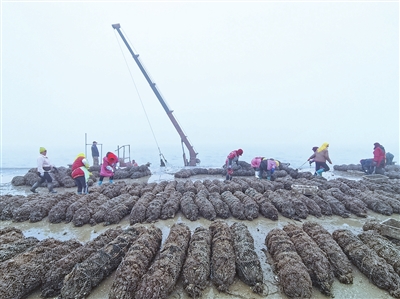 “现在是海蛎子大量上市的季节,每天在这里上岸的海蛎子超过10万斤,不仅个头大,味道也鲜美……”老张告诉记者。当天11点半左右,老张的两条养殖船陆续靠岸,数百条海蛎子笼被吊装到码头上,几十名渔民和渔家大嫂各司其职,开始忙碌起来。经过两个小时的分拣,海蛎子按照大小分好类,随后被早已等候在码头上的批发商装车运往市场。