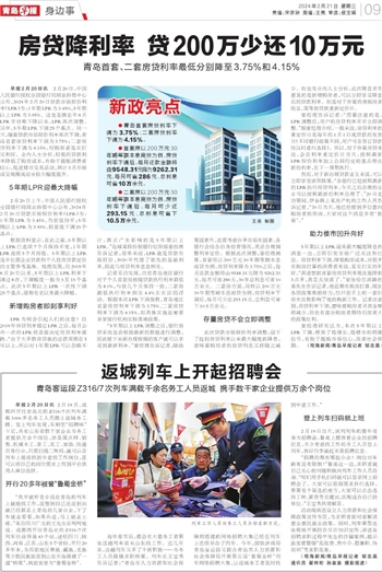 早报2月20日讯 2月20日,中国人民银行授权全国银行间同业拆借中心公布,2024年2月20日贷款市场报价利率(LPR)为:1年期LPR为3.45%,5年期以上LPR为3.95%。这也是继去年8月LPR非对称下降以来,LPR再次调整。其中,5年期LPR下调25个基点。同一天,随着贷款市场报价利率再次下调,青岛首套房贷利率下调为3.75%;二套房贷利率下调为4.15%,对购房者是实打实利好。业内人士分析,较低的贷款利率降低了购房成本,有助于提振消费者信心,促进楼市交易活动,预计3月市场成交规模或迎来较大幅度提升。