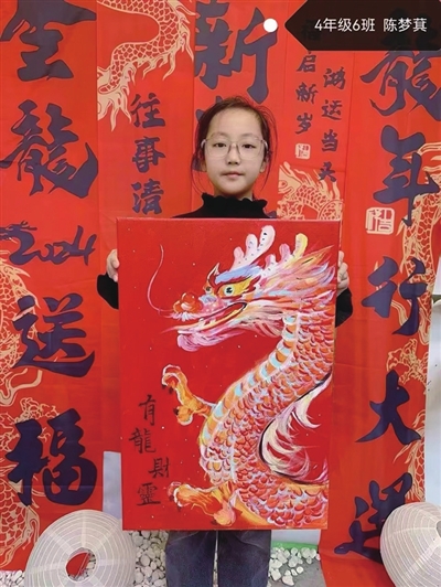 各学科在注重夯实基础的同时,也开展了“年味儿”十足的拓展性作业。语文学科的“我为家乡代言”活动让孩子们进一步了解自己家乡的风土人情,增进了孩子对家的热爱。英语学科围绕“龙”年主题开展趣配音系列活动,让孩子们乐享年味儿的同时也能绘声绘色地积极表达。艺术组的老师布置了写龙年福字和参观画展的作业,孩子们提交的一幅幅创意十足的作品,让人眼前一亮。还有许多同学,观赏了各类画展,同学们沉浸其中。