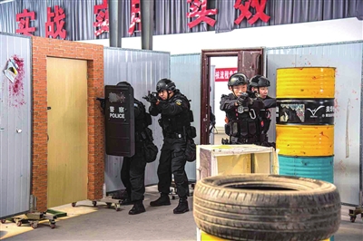 “各自进入战斗位置!”随着青岛市公安局特警支队猎鲨突击队大队长牟云涛一声令下,突击队员们迅速跑步进入战术训练场攻击位置。
