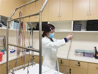 在睡眠监测室的隔壁是睡眠监测中控室,也是张翠林每晚工作的主战场。为了守护患者的“一夜好眠”,他需要不间断地查看屏幕上各条数据线的波动情况,如果某一个电信号突然出现飘红、变粗的情况,有可能是“掉线”了,需要监测师进屋帮患者将导线重新连好。“我们的夜班是每周轮岗一次,毕竟夜间监测挺熬人的,头天下午就要过来做准备工作,剪纱布、整理导线、准备仪器。等患者入睡了,还要时刻留意患者动向,比如流汗了就要过去擦擦汗、掀掀被子之类的,不然影响数据的准确性。”说话间,张翠林带记者来到了准备间,当值技师正在整理设备,准备应对接下来长达16小时的工作时间。