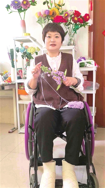 “看到他这么关心照顾我,我也不能整天哭哭啼啼的。”在丈夫无微不至的照料和鼓励下,乔明凤对待生活的态度有了很大转变,虽然身体困在轮椅上,但精神上却重新站起来,她开始努力像个正常人一样生活。“只要脑子不坏,就有生活下去的希望。”想到自己小时候学过钩织,乔明凤开始尝试着用毛线钩织作品。一开始只是钩织一些简单的小物件,随着不断地练习,慢慢地她能钩织出一些技术要求比较高的花卉花束、创意花篮、摆件等,这些作品栩栩如生、惟妙惟肖,挂到网上出售一时间成了抢手货。