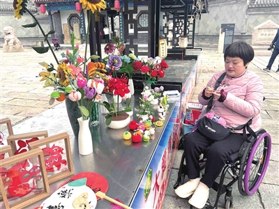 “这是由毛线钩织的花卉花束、创意花篮,这是永生之花,它代表的是永不凋零的爱……这也非常符合我们残疾人永不放弃,顽强生活的精神。所以与其说我们制作的是产品,不如说是我们残疾人对生活的希望,这是我们人生价值的体现。”在青岛市残疾人文创产品大集即墨区文创产品展位前,摊主乔明凤为市民介绍毛线钩织作品的同时,手上一刻不闲地忙碌着。只见她指尖轻轻触碰、手腕灵巧翻转、锦带绕着手指做结,一个精致的盘扣就渐有模样。