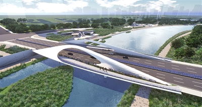 根据此前公示信息,科苑经五路桥梁位于规划科苑经五路跨越张村河处,设计为三跨预应力混凝土连续梁桥,长113米,双向六车道,人行道宽度曲线变宽。记者从施工方展示的效果图上看到,科苑经七路桥最具冲击力,这座桥是一座斜拉桥,有多个细长的支撑塔和拉索。桥梁中央上方有一个巨大的拱形结构,其上覆盖着白色的网状结构。科技园五路桥的桥梁造型灵感来源于水滴落下的那一瞬间。新南路桥的设计理念源于崂山文化传承,“一方水土孕育一方文化”,枣山东路桥的两侧则设计了曲线形造型。
