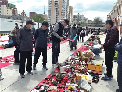 早报4月21日讯 古玩、玉器、根雕、玩具、工艺品、旧书报、老电器……在青岛文化市场上,琳琅满目的老物件摆放在地上,吸引了不少市民驻足挑选。4月20日,青岛文化市场启用仪式在主街区广场隆重举行。