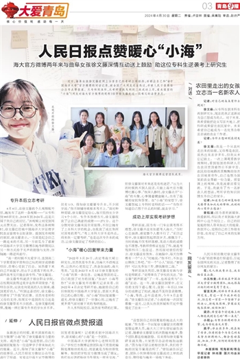 青岛早报大爱青岛A03​人民日报点赞暖心“小海” 2024-04-30 2 2024年04月30日 星期二
