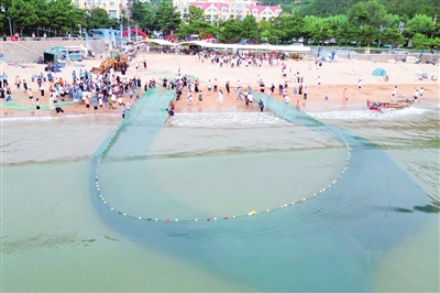 在流清湾沙滩,青岛早报记者看到,两位渔民肩扛一根木桩挑起渔网,另外6人则一起发力,托举着硕大的渔网将其运到停泊在岸边的小木船。他们先是将渔网的一端留在岸边,随后木船沿着浅海缓缓行进,一边将渔网撒向水中,隔出一片半圆区域,大约半小时后,一切准备就绪,“拉大网”活动正式开启。