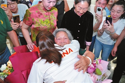 “来了,来了!”当陈梦出现在大家视野中时,现场一片欢腾。陈梦给了父亲陈樑一个大大的拥抱后,就迫不及待地扑入了姥姥的怀中。默契的是,祖孙二人都为彼此准备了花束,陈梦的姥姥把手中的荷花递给外孙女,“梦梦,奥运赛场你最棒,现在终于有空回家了。”陈梦激动地俯下身子拥抱了坐在轮椅上的姥姥,把手中的向日葵递给姥姥,调皮地说,“谢谢姥姥给我送花,我也送您一束。”随即与姥姥“交换”花束,逗得众人哈哈大笑。见到心爱的外孙女,姥姥高兴得说不出话,紧紧搂着陈梦反复用手摩挲她的后背。