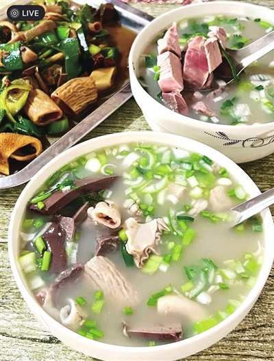羊汤饼子是很多北方城市冬天早餐的标配,很多人家的早餐餐桌上,都有羊汤饼子的身影。前一天晚上开始熬羊汤,家里慢慢飘出羊汤香气。第二天一早,下楼买几张馅饼或烧饼,大锅里盛出一碗“咕嘟咕嘟”开着的乳白色羊汤。切好的羊肉片、羊肝、羊肚,通通加入大碗里,大勺子在锅里一搅,手起勺落,正好一大碗,再加一把葱丝……这样一碗羊汤下肚,一上午都得精神百倍。