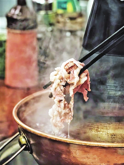 上好的羊没有膻味,油脂中富含奶香,切得薄薄的羊肉鲜味直蹿鼻孔,铜锅汤里没什么讲究,清水紫菜虾米皮,讲究的是这蘸料,芝麻酱腐乳韭菜花,搅拌均匀蘸上羊肉,鲜上加鲜。羊身上可以做涮肉的部位非常多,也很难分出些优劣,只是个人喜好不同罢了。连接肩、腰、腿三个方向的一块叫小三叉,腿、尾巴、腰三个部位的连接处叫大三叉,这两个地方都可以拿来涮。黄瓜条、羊腱子、磨裆、肩胛骨上的肉现在很多人也喜欢,带一块脆骨,人们也爱涮。总之最重要的是羊肉要鲜美,颜色很浅很嫩的羊怎么涮都是无可挑剔的。