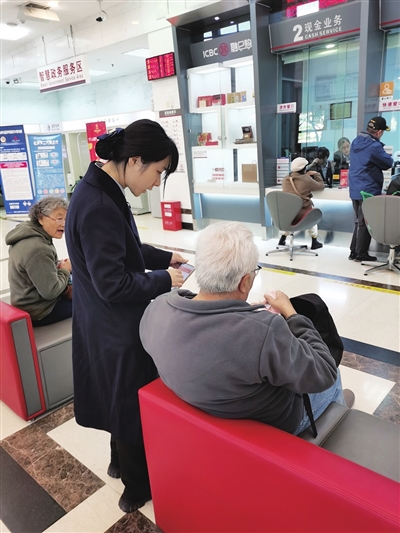 11月26日上午,记者来到工商银行市南二支行,一进门就看到大堂经理正在帮助一位老年人使用手机银行APP。记者了解到,这位老年市民于先生不大会操作手机银行,他很喜欢来工行找大堂经理帮忙,就是因为服务特别周到和暖心,每次都会满意而归。在该行营业大厅内,老年人可优先办理业务,填单台下的柜子里配备轮椅、老花镜等老年人专属服务设施,地面还设置“轮椅等候专区”标识。当记者询问:“老年人习惯的存折、存单业务还有吗?”工作人员称:“这些都有,可根据老年人的需求来办理。”