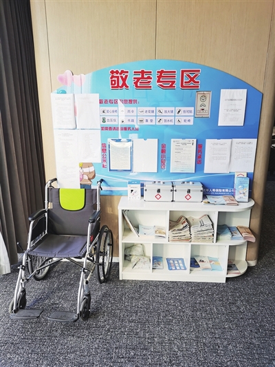 记者来到位于山东路华润大厦的太平人寿青岛分公司第一支公司客户服务中心,大厅内设有老年人窗口,在敬老专区内配备轮椅、急救箱、血压仪、雨伞、靠垫等助老服务设施。