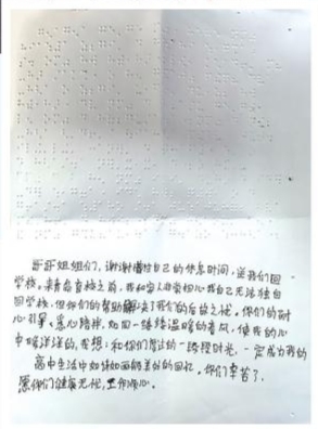 感谢信是用盲文写下的,在白色信纸上留下了深深浅浅无色的“点字”。信的末尾,张慧玉请朋友帮她“翻译”了一下信的内容,方便地铁的哥哥姐姐们阅读。她在信中写道:“你们的耐心引导、悉心陪伴,如同一缕缕温暖的春风,使我的心中暖洋洋的。和你们度过的一段段时光,一定会成为我的高中生活中如诗如画般美好的回忆。”