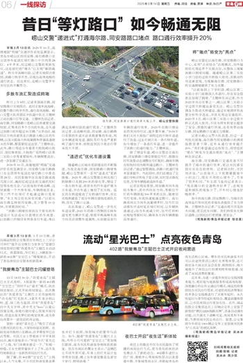 早报3月13日讯 2020年10月,高德地图“明镜”交通评价系统监测显示,青岛市崂山区的同安路、海尔路路口在全国停车延误红绿灯路口中位列第28位。4年多来,经过崂山交警的更新优化,这处曾经的“堵点”已实现“解困疏通”。昨日早高峰时段,记者实地探访看到,该路口秩序井然,呈现出高效流畅的通行状态。而这背后,是崂山交警多年来付出的不懈努力。